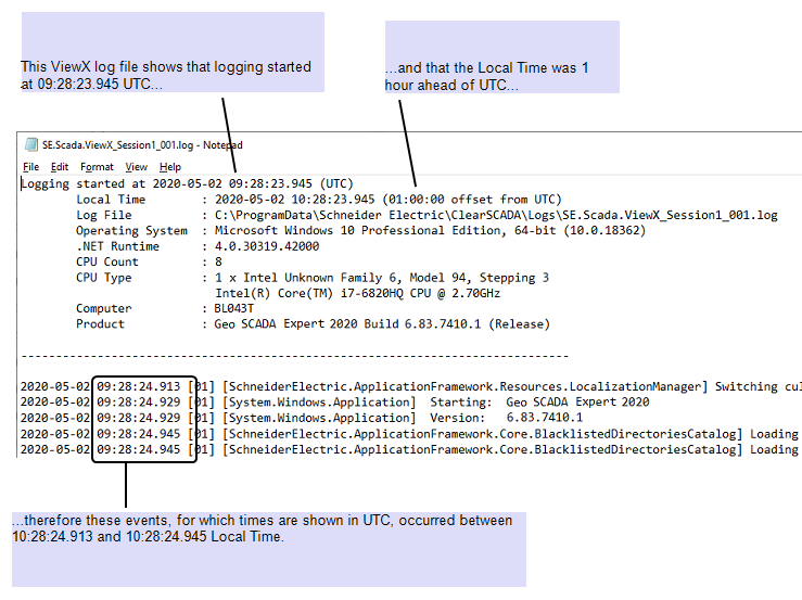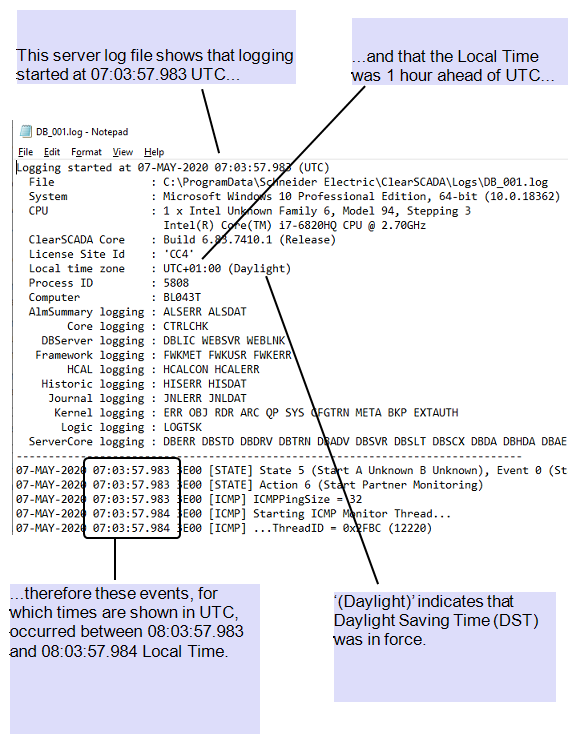 Any log files generated by Geo SCADA Expert show time values in UTC. The log file header indicates the Local Time zone that applied at the time that the log file was generated. The Local Time zone is shown as an offset from UTC, enabling you to ascertain when a particular activity occurred in either UTC or Local Time.