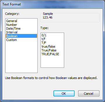 Select the Boolean category in the Text Format window to use a format that is the Boolean (True or False) equivalent of a numeric value. For instance, if you want to display the value of a 1-bit digital point (0 or 1) as the text ‘F’ or ‘T’.