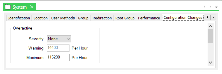 Use the Configuration Changes tab on the Root Group Form to enable or disable and define a warning limit for the number of configuration change records that you expect to created per hour. In addition you can set the maximum number of records stored in a granule. Once a granule reaches the maximum size all further records for the granule are discarded.