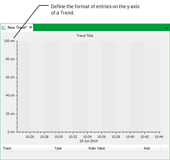 To specify the default format of the y-axis on a pre-configured Trend (a Trend created using a Trend database item), you use the Format settings on the Edit Y Axis window. To apply the format to all new pre-configured Trends, you access the Edit Y Axis window from the Options window (see Define the Default Settings for New Trends). By default, the y-axis of a pre-configured Trend displays the range of values for the first item for which you add a trace.