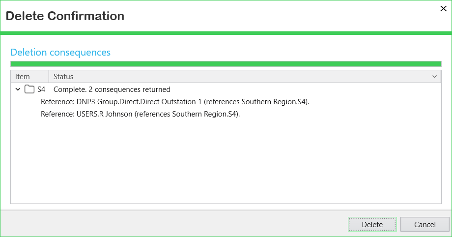 If deletion is confirmed by selecting the Delete button, the outstation will revert to using the World Area of Interest, and the user’s S4 Area of Interest will be deleted. If this was the only Area of Interest allocated to that user, Geo SCADA Expert generates a diagnostic message.