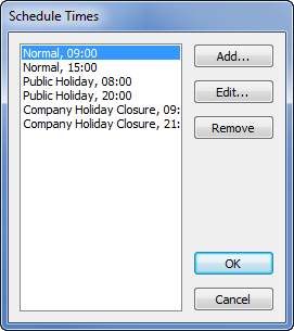 The entry is removed from the list in the Schedule Times window. - Repeat steps ii to iii for any other events that are now obsolete.