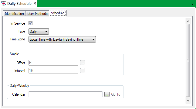 3. Define the type of Schedule, the time zone in which it operates and whether the schedule is in service (see Define the Basic Schedule Properties).