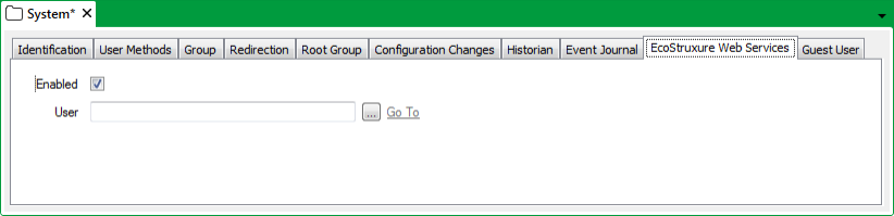 Use the EcoStruxure Web Services tab on the Root Group Form to enable or disable EcoStruxure Web Services (EWS). When you enable EWS, you need to specify an EWS user account. You can then control the access that EWS clients have to the Geo SCADA Expert system, by defining the user account's security settings (see User Accounts).