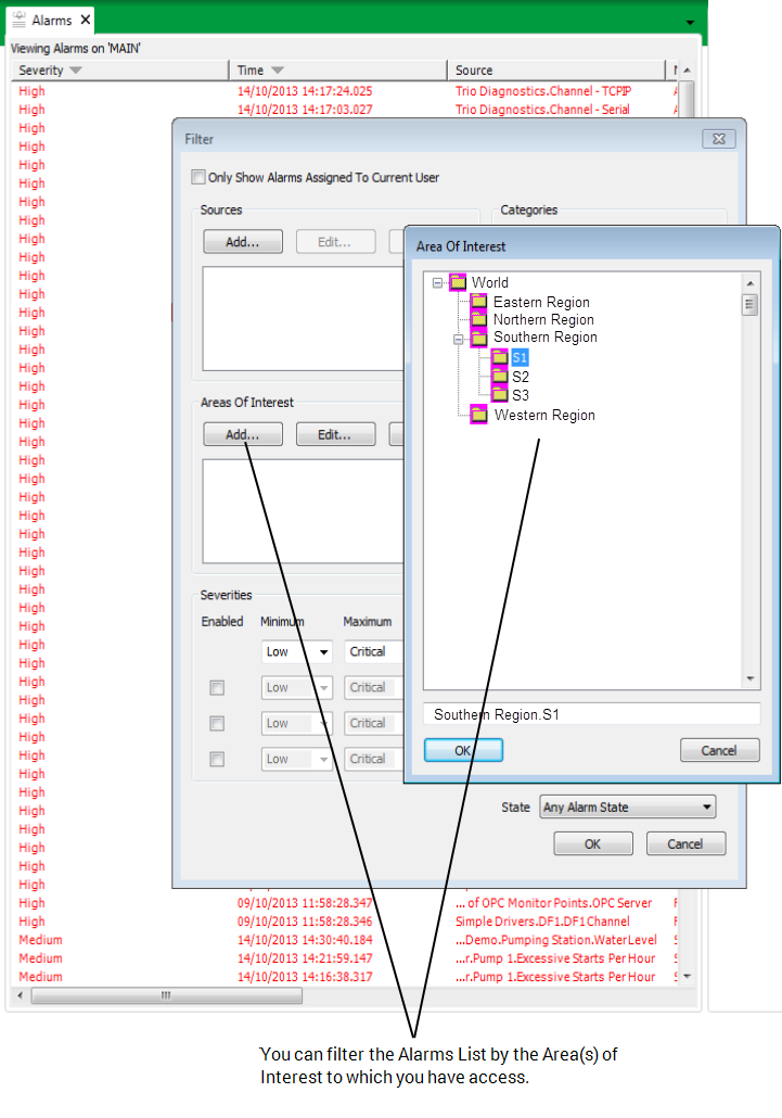 Users can only filter alarms by the Area(s) of Interest that are allocated to their user account, or by Area(s) of Interest that are contained within those allocated areas.