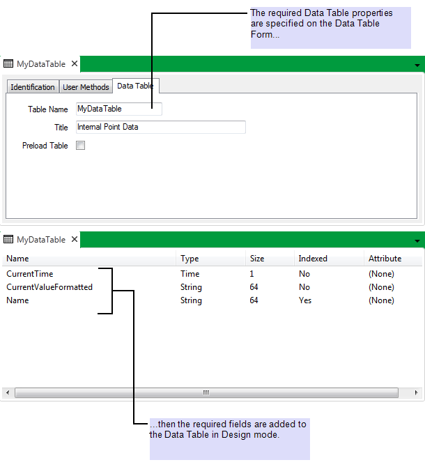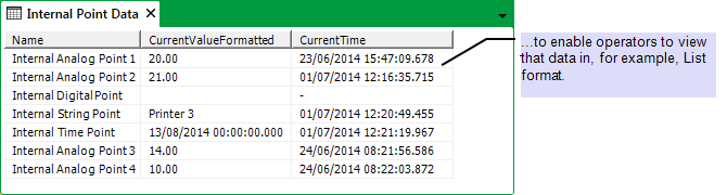 A Data Table, named ‘MyDataTable’, is to store values of the points that are located within an ‘Internal Points’ Group in the Geo SCADA Expert database. For each point, the Data Table is to store these values: the point’s name, value, and the time that the point data was last updated. The Data Table is used to take a 'snapshot' of the point data at a moment in time, so that users can view the point data from when the snapshot was made, and compare it with the current 'live' data.