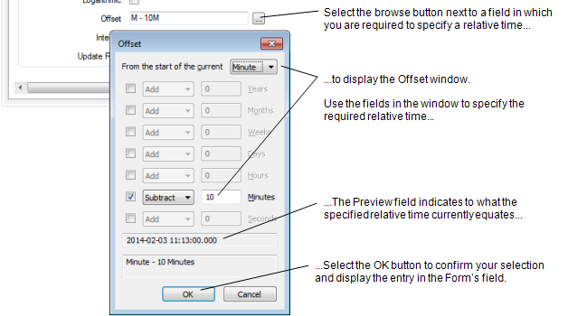 7. Select the OK button to close the Offset window and display the specified relative time in the field on the configuration Form.