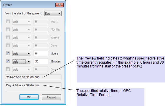 You can use the Offset window to specify a relative time in OPC Relative Time Format. The window is displayed when you select the browse button next to a field in which you are required to specify a time that is relative to the present time.