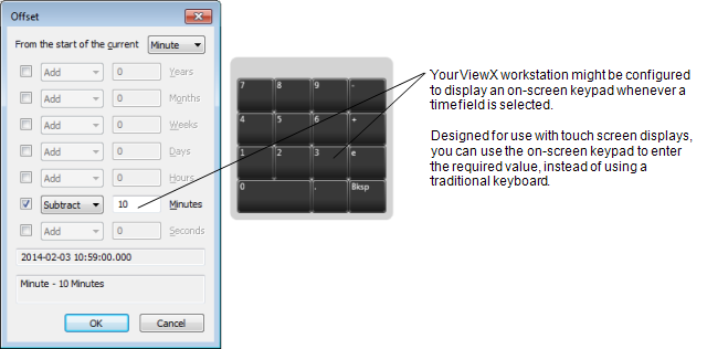 If the Offset window is accessed from a ViewX workstation on which the On-Screen Keyboard feature is enabled, a keypad is displayed on-screen whenever you select a time field.
