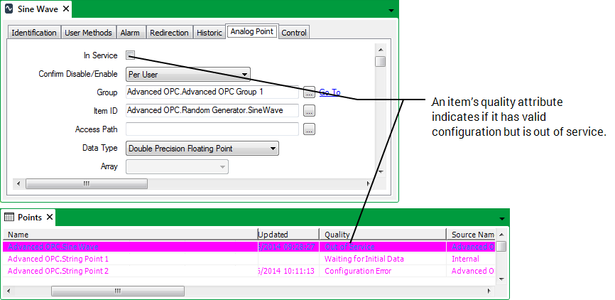 The Quality status attribute of an item that has valid configuration but is not in service indicates that the item is ‘Out of Service’.