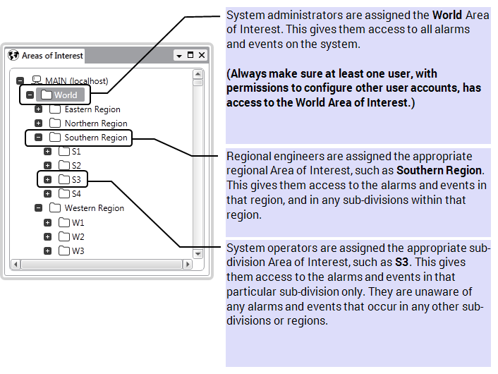 Areas of Interest are hierarchical—by defining different ‘levels’ of area on a system, you can restrict alarm and event notification by different amounts for different users. You can organize your Areas of Interest so that they are up to 16 'levels' deep; this is in addition to the Default Area of Interest (which is typically the 'World' Area of Interest).