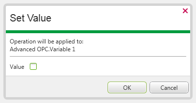 With a Boolean Variable, a Value check box is displayed, rather than a Value field. Select the check box to set the value to True; ensure the check box is clear to set the value to False.