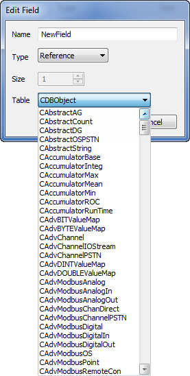 The Table options vary, depending on the drivers that are installed on your system. For information on database tables and the database hierarchy, see Understanding the Database in the Geo SCADA Expert Guide to the Database, and see Working with the Database Schema in the Geo SCADA Expert Guide to the Database.
