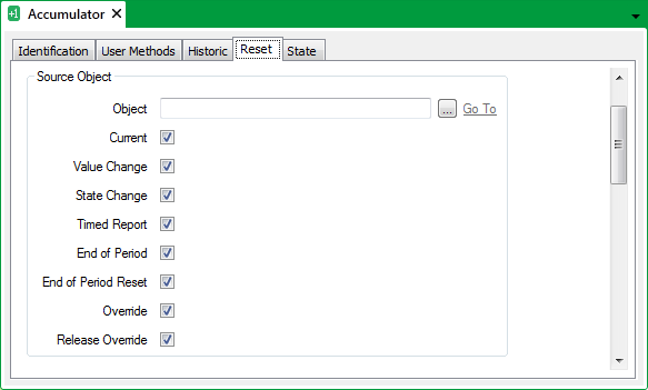 Use the fields within the Source Object section of the Reset tab to specify the item that is to provide the source for an Accumulator and the type(s) of data that the Accumulator is to process from that source: