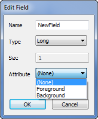 - Foreground—Only applies if the field’s Type is set to Color, Long, or Unsigned Long (see above). Select the Foreground option if the value of this field is to determine the foreground color that is used to display the records’ entries.
