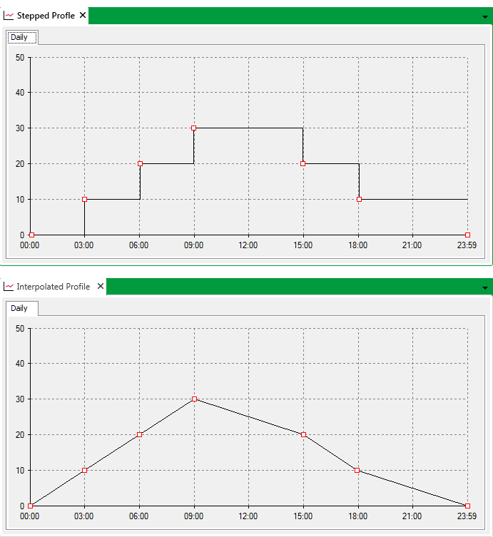 These two Profiles contain the same vectors—the Mode on the first Profile is Stepped, while the Mode on the second Profile is Interpolated.