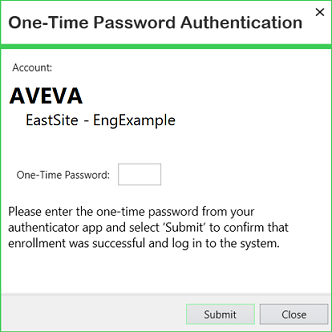 To complete the enrollment process in Geo SCADA Expert, the user is then invited to enter the one-time password that the authenticator account has generated. They enter this into the One-Time Password Authentication window in Geo SCADA Expert.