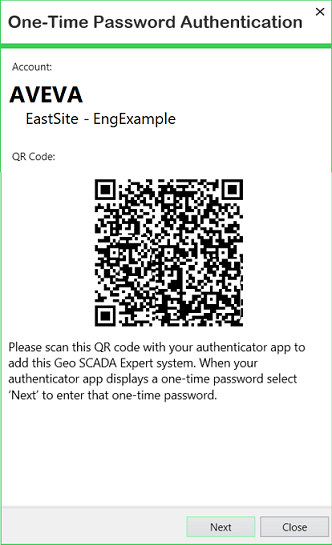 This triggers Geo SCADA Expert to check for User Accounts that are configured to use two-factor authentication but that are not currently enrolled. It places those User Accounts into an enrollment phase. When the users of those User Accounts next attempt to log on, they are required to enroll. As part of the enrollment process, Geo SCADA Expert displays a One-Time Password Authentication window that contains a QR code. The window displays the Company Name and System Name of the deployed two-factor authentication, along with the username of the user's User Account (in this particular case, 'EngExample'):