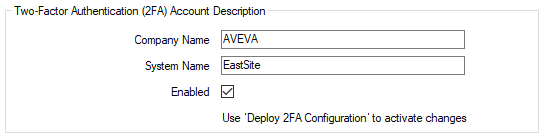 Select the Enabled check box to activate, but not deploy, the above two-factor authentication on the system. The configuration in this Two-Factor Authentication (2FA) Account Description section of the tab then becomes the 'proposed' two-factor authentication on the system. To actually deploy this two-factor authentication configuration across the system, use the Deploy 2FA Configuration pick action on the Root Group. Once deployed, any users whose User Accounts are configured to use two-factor authentication will have to enroll successfully for two-factor authentication before they can access the system. Take care to ensure that suitable User Accounts exist to provide access for any clients, or client applications, that do not support two-factor authentication (see Considerations and Limitations (2FA)).