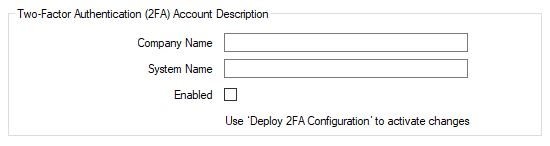 Clear the check box (the default) on systems on which two-factor authentication is not required. Also clear the check box if the Company Name and System Name have been defined in this Two-Factor Authentication (2FA) Account Description section of the tab, but that configuration is not to comprise active two-factor authentication configuration.
