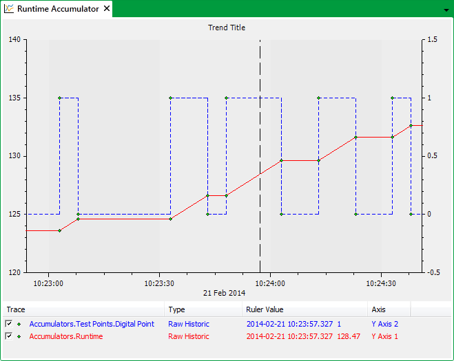In the Trend shown above, the Runtime Accumulator trace is attached to the left y-axis and the Digital point trace to the right y-axis. The value of the Runtime Accumulator increments whenever the Digital point is in State 1 (True). The Accumulator value indicates the amount of time that the Digital point is in the True state since the Accumulator last reset.