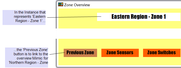 An example illustrating this is shown below. The engineers perform similar changes on all Instances of the Link Parameters, to ensure that the ‘Previous Zone’ and ‘Next Zone’ buttons link to the relevant adjacent overview Mimics in each Instance.