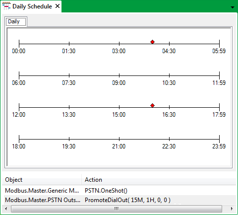 The actions that the Schedule triggers at those times are a one shot call to an outstation (Master.Generic.PSTN Outstation), and a dial out promotion to an outstation set (Master.PSTN Outstation Set).