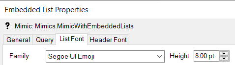 Unicode characters that are above the 16-bit (65535) range, such as Emojis, are not displayed correctly in all areas of the interface due to GDI+ graphics. However, Windows provides a fallback font, 'Segoe UI Emoji', which you can use for displaying characters over the 16-bit range on, for example, Mimics and embedded Lists. To do this, you have to set the font.