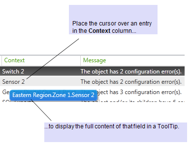 2. Place the cursor over an entry in a particular column in the Messages window.