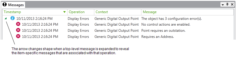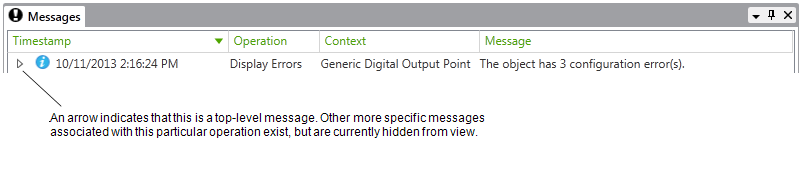 Some tasks result in the generation of multiple messages. With such tasks, Geo SCADA Expert displays a single top-level message in the Messages window. The message is prefixed with an arrow to indicate that other messages associated with that particular task are available for viewing.