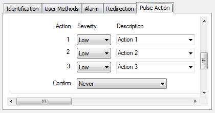 With some types of Pulse Action, the Confirm combo box appears on a different tab to the other properties that are described in this topic. (It typically appears on the Pulse Action tab, rather than the <Pulse Type> tab.)