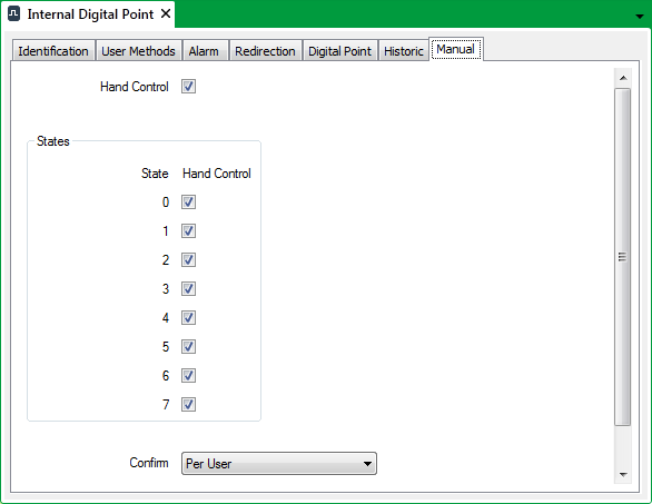 • Select the check box to allow that state to be hand controlled, either manually using the Hand Control pick action (if enabled, above), or automatically using Logic or a data access application.