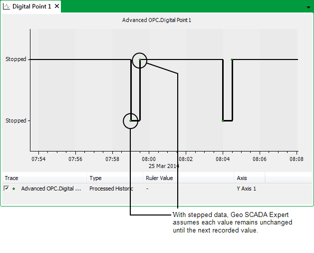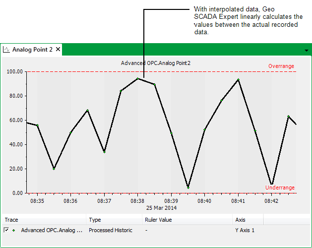When zooming in to display a very small time scale on a Trend, such as 60 seconds, only a few raw data values might be visible at such a scale. With a trace that uses processed data, Geo SCADA Expert will linearly interpolate between the raw values, to produce a trace that includes both interpolated (calculated) values as well as the actual values that were reported or read from plant.