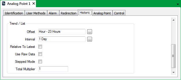 Use the properties within the Trend/List section of the Point Form’s Historic tab to define which time period of data is included on Historic Trends and Lists by default. Also use the section to specify any processing that Geo SCADA Expert is to undertake when presenting the data as a Historic Trend.