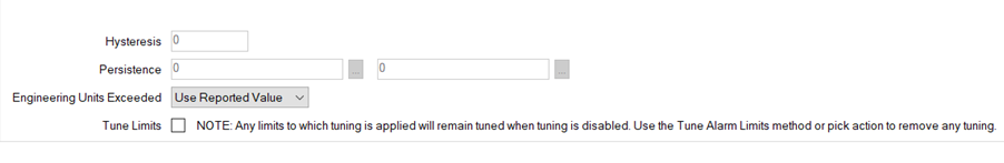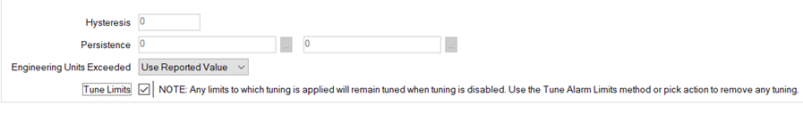 Any alarm limits to which tuning is applied will remain tuned when the Tune Limits check box is clear. Use the Tune Alarm Limits pick action to remove the applied tuning.