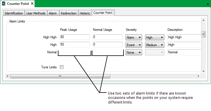 Normally, counter-type points have one set of alarm limits that you use to define which point values correspond to alarm conditions (see Configure the Limits for a Counter-Type Point).