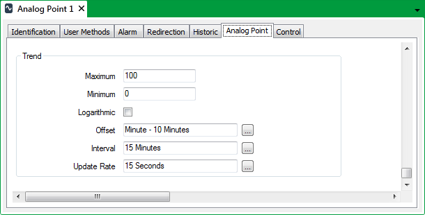 When a Current Trend is displayed for the point, the Offset and Interval entries define the time period of the Trend, and the start time of the x-axis in relation to the present time.
