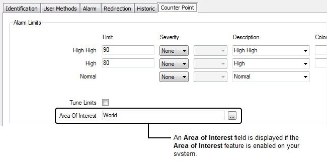 If the Area of Interest feature is enabled on your system, an additional Area of Interest field is displayed within the Alarm Limits section on the <Point Type> tab.