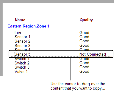 You can copy content from the Crystal Reports Viewer and paste that content to another application. For instance, you might want to copy a particular field or row of data into a document, or paste the content into the Notes that are associated with that report in Geo SCADA Expert