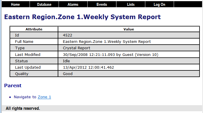 Every item in the Geo SCADA Expert database has its own Status display (also referred to as a View window or View dialog). You view an item's Status display by selecting that item's View Status pick action or menu option. The Status display provides information about the status of the selected item, presenting the information in the form of 'status attributes'. For further information about working with Status displays, see Status Displays.
