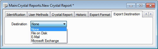 Use the Destination field on the Export Destination tab of the Crystal Report Form to define the export destination for each report.