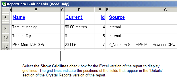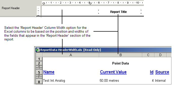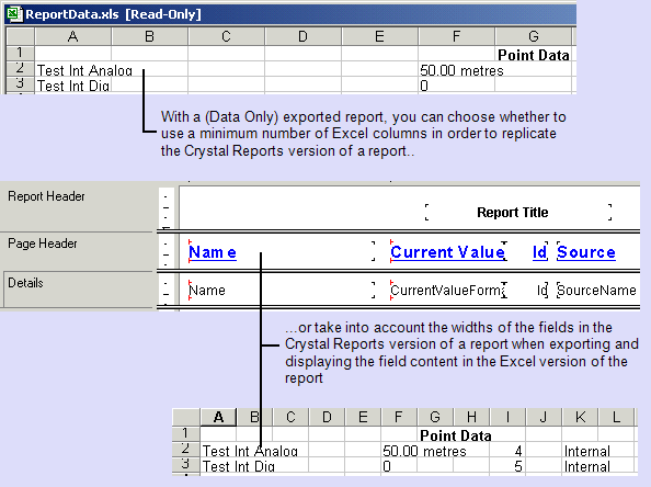 - Column Width Based on Objects in Area—Use this combo box to specify the criteria that you want Geo SCADA Expert to use for assigning the column widths in the Excel version of a report. As Header and Footer ‘field objects’ are optional in Crystal Reports, you should only select an option that is applicable to that particular report.