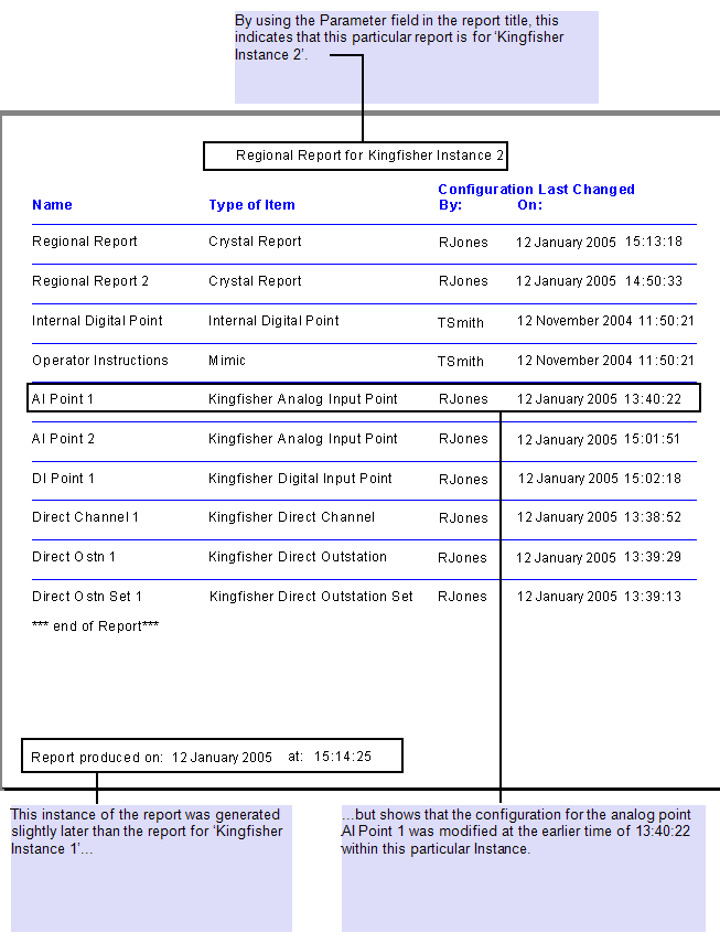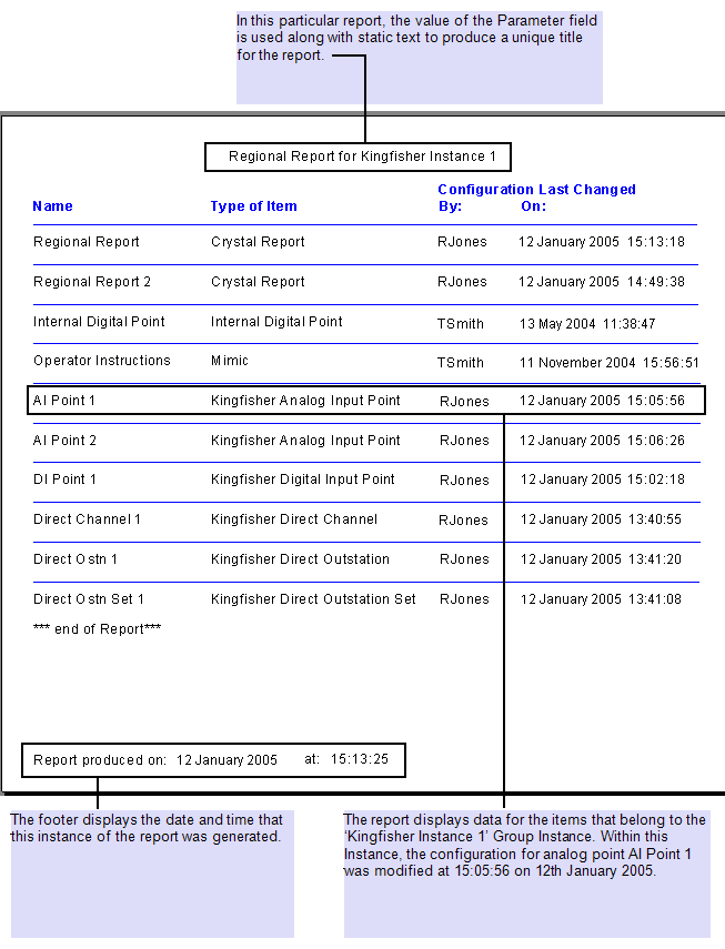 A report is to list the items in a Group Instance, with an indication of when each item’s configuration was last modified. (Remember that each Instance contains the same items as the Group Template. Depending on the Property Overrides that are specified for those items, some configuration properties, such as an outstation’s address, can be overridden within each Instance.)