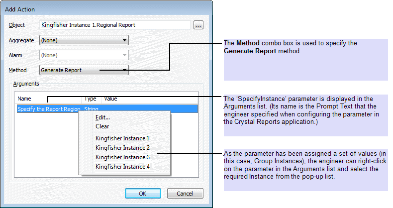 Within ViewX, each Instance of the report is attached to a Schedule. As each report is dragged onto its Schedule, the Add Action window is displayed. The engineer that is configuring the Schedule uses the window to specify the Generate Report method, along with the ‘region’ (Group Instance) for which the Schedule is to generate a report.