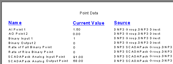 The resulting report lists only those points that appear within the Groups that start with the name ‘DNP3’: