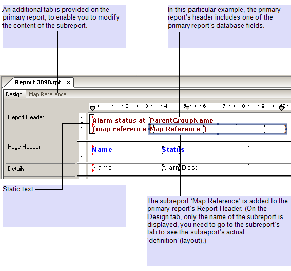The subreport is embedded in the primary report’s header. Additionally, in this particular report, static text is also added to the report header, along with one of the database fields from the primary report: