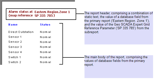 Each Geo SCADA Expert Grid Reference Parameter stores data that specifies the geographical location in which an area of plant is located. However, that map reference data is not directly related to the database records that store the actual plant data—there is no direct link between the database table that stores the grid reference data, and the database tables that store the plant data for a particular zone. Therefore, in order to include the Geo SCADA Expert Grid Reference Parameter data in a report, that data is included in a Crystal Reports subreport.