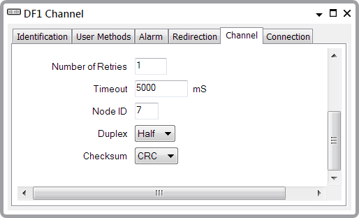 Use the fields toward the bottom of the Channel tab to specify the channel’s communication properties. The Number of Retries and Timeout fields are common to channels on many simple drivers—for information, see Configure the Basic Channel Properties in the Geo SCADA Expert Guide to Simple Drivers. The fields that are DF1-specific are explained below.