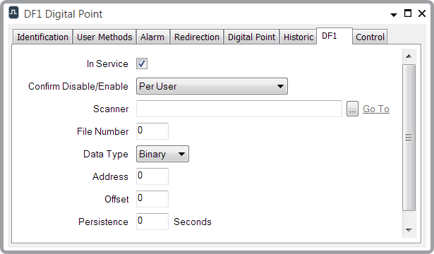 - Persistence—Specify the time that the DF1 driver waits before it reports a change of state. Enter the time in seconds. This allows the driver to ignore fleeting changes in point state.