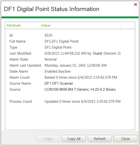 The Status display for each DF1 Digital point provides information about the present state of the individual point.